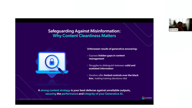 Thanks. So I think we're gonna give it about thirty more seconds. Perfect. We're just gonna give a little bit of extra time so everyone can join, and, Hailey, you'll introduce us and start us off. Right? Absolutely. So welcome, everybody. I hope everyone is having a wonderful rest of their day so far. Good morning or good afternoon wherever you may be. Please use the chat. Let us know where you're coming from. AI I hope we will have a jam packed agenda, which I know we do coming up. So welcome, welcome, everybody. Feel free to, drop your chat and your location, and we'll get started in just a few moments. Hello. Welcome from Boston. We've got New Jersey, Texas. Welcome. Welcome. Oh, everyone is having a wonderful Wednesday so far. Welcome. Welcome. We've got Connecticut. We've got Florida, UK, Virginia, Ohio, UK, Wales. We've got place people from all over. So with that, we'll go ahead and get started. So, again, good morning or good afternoon, everyone. My name is Haley, and I'll be your host as we discuss today's topic, which is findable, relevant, chosen, how modern search impacts your bottom line. Now this webinar is sponsored by Coveo and WearAware and hosted by VIB. Today's webinar will be about forty five minutes long, and we'll save the last fifteen minutes or so for q and a. Please use the q and a box at the bottom of your window to ask any and all questions, and we'll do our best to answer those at the end of the presentation. And we do have a great poll question coming up very soon in the presentation, so please ensure that your pop up blocker is turned off. And without a further ado, I'd like to introduce our speakers today. We've got Patricia, marketing manager, workplace and generative AI from Coveo. We've got Rob, associate director of engineering with WearOware. Alright, guys. You may take it away from here. Amazing. Thanks again, Haley, for having us, and thanks, Rob, for joining us today. Hi, everyone, and welcome. I'm so thrilled that you can join us for today's session, findable, relevant, and chosen, how modern search impacts your bottom line. If you're here today, you likely have really incredible website content that you're looking to share and to make more discoverable. And, of course, even the best content can underperform if your customers can't find it or worse if it doesn't drive action. And so today, we're going to explore why digital engagement often falls short, not because of the content that you've created and its quality, but because of how it's discovered. We're gonna dive into how AI powered content discovery, intent based search, and generative answering are helping brands connect people to the right content at the right AI, and what that means to move from a reactive delivery to proactive business driving engagement. And, of course, I'm joined by the amazing Rob Strode, an associate director of engineering at Wear O Wear, which is a digital agency that's helping clients to unlock the full value of their content through smarter experiences. Rob, thanks again for joining us today. Do you wanna tell us a little bit more about yourself? Yeah. Sure. I've I've been working, in software as a developer for over twenty years now, and I guess I have a specialization in integrations, complex back end integrations, as well as search technologies. I've worked with a lot of different platforms. Coveo just happens to be one of my favorite search platforms, so I'm kind of become a little bit of an evangelist for it. And I'm excited to sort of share what it's been like to work with the platform, like, in the trenches with the development team actually implementing, you know, excellent search. So Thanks so much. It's an honor and a pleasure to have you here, and I'm excited to learn more about your expertise. And, of course, for those of you don't who don't know, Coveo is an AI powered search and generative experience company that's existed for about more than twenty years now. We have twenty years of search experience and more than a decade of experience in AI and innovation and knowledge discovery. And so we're so happy to have you here today. We're also gonna do some quick, some quick housekeeping. And so AI Haley mentioned, of course, you're going to have access to the q and a panel on screen, and we'll have a q and a section at the end of today's presentation. If we miss any of your questions as well, we'll follow-up later with you via email, and this webinar should be available, for you, the prerecording in the next few days. So thanks again for joining us. So we're gonna move on to the first section of our webinar. So, Haley, we're gonna be setting up our poll. And the first question that we wanted to ask you all today is what are some of the biggest challenges that you're currently facing when it comes to content discovery at your organizations? Is it that content is fragmented or lives in too many systems or that your current search tool isn't powerful or intuitive enough? Maybe it's hard to use and a little bit confusing. Is there a lack of good analytics to measure the effectiveness of your search experiences and your content journey? Are you unsure how to integrate AI or advanced features effectively into your platform? And is content not well structured or properly tagged? So we're just going to give you a little bit of time to answer this. Alright. Let's give it fifteen more seconds. Gonna sip my coffee. Alright, Hailey. Let's close this poll and take a look at the results. Oh, this is interesting. Yeah. We've got some great responses for the the quiz. So, we do have the first question here on is how does your organization assets whether customers find it easy and what they need. We've got some great results from that. It looks like the top contender is that they occasionally review search and engine analytics, but lack consistent tracking. Second question is discovering a core part of your business strategy. That is up there with fifty two percent somew