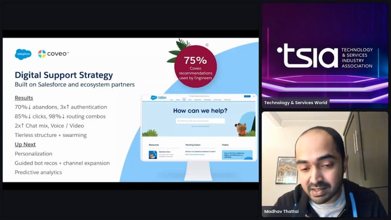 Hey, everyone. I I I trust you can see us. Welcome to the session. We've had some, technical challenges here. So Bonnie is actually dialing in, on my phone, and, hopefully, everyone can hear her. If you cannot, you know, throw something in the chat, and we'll try to make sure that she, that, that we can we can repeat whatever the question is or whatever she said. But, Bonnie, I will hand it off to you to get us kicked off here, and I will, run the slides. Awesome. Thank you, Nav. Hello, everyone. Thank you so much for joining us today. Very excited to be here, a part of, this conference. My name is Bonnie Chase. I'm director of product marketing at Coveo. And, really, today, what we wanted to do was, talk through how to deliver relevant support as deals. So, I've I've I'm joined here by Manavasatai from, Salesforce. He's VP of strategy and operations there. And we'll just talk through a little bit about their approach to, you know, how they deliver relevant support at scale. So just for a little bit of background, but not on the second side. You know, just to tell you a little bit about Coveo, we are a market leader in enterprise applied AI for relevant digital experiences, which means we're the intelligence behind your, customer support and service experiences, offering content and data from across the enterprise, proactive recommendations and intelligent search, cross cloud and cross channel delivery and insights, and purpose built machine learning that starts learning from day one. And so that's a little bit about, Coveo. And really, you know, in this role, what we do is is we're we're connecting with people and really understanding how to deliver that better support. Now when we think about delivering better support on the next slide, as you know, customer support is the front lines to the customers. It's critical to be able to scale your support organization to meet increasing customer demands. And we know that the better your support is, the happier your customers are, which in the end adds more value and creates deeper relationships with your customers. The challenge is we're often trying to balance both a good experience and cutting costs. We want to be efficient, but we also want to be effective. Next slide, please. And so, you know, when we think about these customer interactions and and why it's so important to, ensure that we're creating good customer experiences, you know, one of one of the the things that I like to point out is that it actually costs less to maintain an existing customer than to invest in new ones. And so instead of thinking about customer support as a cost center, you know, really, this this is a part of the organization that is adding more value to your relationship and that customer like that value. So a key piece has been thinking about scaling is considering what your customers want. And so on the next slide, just a couple of stats to share, you know, really personalization is key. If you if you, you know, look at the stuff that are out there, people want to have experiences that are relevant to them. You know, we have we're kind of consumed with an overwhelming amount of content. You know, we have knowledge created in a bunch of different parts of the organization, and customers are met with information overload. And really, you know, when they're, engaging in these support experiences, they don't want a ton of information in their face. They want what's relevant to them in that moment. And so when we look at the the these stats, you know, we we often get a lot of information about consumers. But b to b, you know, is no different. And, you know, people just expect businesses to know their unique needs and expectations. And in order to deliver, you know, a million unique experiences to a million unique users, you need AI. But it's also a combination of things. Right? It's it's technology, but it's also people and process as well. And so with that, you know, that that question remains on the next slide. You know, how do you scale to meet increasing demand and volume? And this is really why I've I've asked Madoff to join us here today. You know, as a customer, Salesforce has has achieved a lot and really wanted to kind of share the story. So, so, Madam, could you tell us a little bit about yourself and, your role at Salesforce and what your team is focused on? Yeah. Thank you, Bonnie. I'm really glad to be here, with all of you today. Looking forward to this to this session. So, I've been at Salesforce a little over a year now, actually getting close to a year and a half, and I run strategy and operations for our global support organization, and I'll talk a little bit about our organization on the next slide. But we manage a couple of key parts of our transformation journey, in our support world. One is, we have teams that focus on, each part of the experience and think about how can we improve it from a process perspective, a technology perspective to really drive the outcomes that matter for our customers as well as our, our support engineers internally, and so that's a key focus for my team. In addition, my team also runs all of our central business operations activities, to help manage and scale our organization. So really happy to be here and happy to talk about this more. And, you know, you have a huge support organization. Can you give us an overview of what that looks like? Yeah. Happy to. So we are a global organization and we support, a large majority of Salesforce products. Some of our, more recent acquisitions still run independently, but we but we support all of our customers globally across regions, across different industries, and across all products as I mentioned. We've got multiple hub locations globally and about, close to three thousand five hundred people actually now. This slide is a little out of date, but, about thirty five hundred people, across our our support engineer organization, in multiple languages. What's probably good to