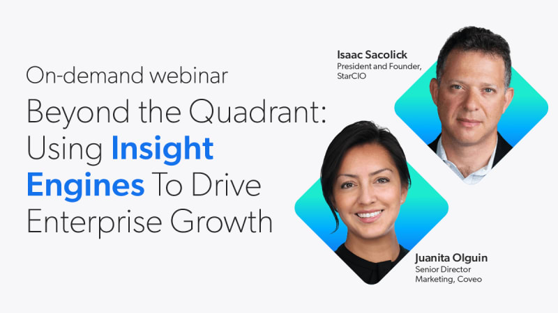 Alright. Let's go ahead and kick this one off. Thank you for joining us today. My name is Juanita Oguin. I lead product marketing for our platform solutions at Coveo. I am really excited to be here with our guest, Isaac, who'll introduce himself in just a minute here. But did wanna let you all know that we're gonna take the next thirty minutes to give you our view and our perspective on beyond the quadrant using inside engines to drive enterprise growth. We'll break that down a little bit for you. If you have questions along the way, please feel free to chat them. We are going to address those at the end of the session today. And so, again, wanna thank you for taking the time to explore this very important topic for us. Isaac, over to you to introduce yourself. Greetings, everyone. My name is Isaac Sikolic. I'm known for being a CTO and a CIO that now works with organizations around the digital transformation efforts. I partner with the best technologies, in terms of, technologies that can really transform how organizations are operating. And I do a lot of writing and speaking. I, write per c I o dot com for InfoWorld, for my blog, and, hopefully get to meet some of you on the road as I'm usually keynoting at different events this time of year. Awesome. Thanks, Isaac. Alright. Let's jump right in. So for those of you not familiar with the Gartner Magic Quadrant for insight engines, it's actually a report that's been around for Coveo the last ten years since two thousand and six. And as of the time, it's actually changed a few names. It was actually the information access technology report, then it changed to enterprise search, and now it's referred to as insight engines. And for those of you wondering what does that mean, you can see a nice definition here. It's about applying relevancy methods to discover, analyze, describe, and organize content and data, enables interactive and proactive delivery or synthesis of information. And the whole idea is to deliver great experiences to those customers or employees engaging with your information. There's a lot there in that definition. So, Anusik, I wanted to ask you as a former CIO and CTO, how did you think about the magic quadrant for Insight Engines? Well, first, I'm gonna do what you all do, which is look at who's in the upper quadrant and to make some notes and say, okay. I see Coveo in the upper quadrant. That's great. I'm gonna get a dip dig deeper. Right? And I'm going to look at what Gartner has written as the strengths and weaknesses, of any of the vendors, that are listed in a product category. And the reason I'm doing that is, you know, there are there's first is it's gonna give me some sense of how to go shopping, how to ask questions, what are the capabilities that are truly relevant to me. A lot of times they'll get, high marks for something that are very I'm very interested in, so I'm gonna follow-up on that. And sometimes I'll see things that are, low marks on something that is just not relevant to my business. And so, you know, that's gonna bake into the question how I'm really thinking about the category. And and lastly, I really wanna see how they define the category. Right? We you know, they shifted language that happens a lot in technology. They come up with, their own jargon or use industry jargon. But what I could see from this report, you know, the ability to ingest content and data, the ability to enrich the content and data. Juanita, we've talked about that in previous, webinars that used to be separate platforms. You'd have to buy a a platform for ingesting, a separate platform, for enrichment. Now they're putting this all together under insight engines, delivering results to multiple UI. So I'm not just building one search interface, ability to evaluate and tune relevance, ease of use, which we'll talk about, very important to me, multiple languages, and probably the most differentiating thing that I think you should be looking at is personalizing experiences. Right? We're not a one size fits all in terms of what questions we're asking, in terms of where we're asking it, what information we're looking for. And so that's really, to me, the hallmark of a really good insight engine. That's great. You covered a lot of important points there, which I know we'll, get back to throughout the presentation as well. Thank you for that. For those of you not familiar with Coveo, we, you know, we wanted to highlight some of the things that we're proud of that came out of the report. For one, we've been a five time leader in the insight engines, while it was named that particular category. But since the report's inception back to two two thousand and six, we've been named, a leader seven times. Also, we're very proud to have been recognized for the broad coverage that we provide across industry verticals and the different areas that we help our different customers, including on their commerce sites, service and support, workplace, customer facing websites. And for us, that really means, you know, we believe that we've we've been very consistent in our ability to provide a vision and execute on that vision, but also to continuously innovate because, you know, the world is changing constantly, and we're we're trying to stay on top of that and sometimes, you know, provide, a more advanced more advanced options for our end users. And, also, we really take our domain expertise seriously. We know that it's important for companies to get guidance to know where to start. So these are just a couple of highlights that I wanted to share, that Coveo was sort of rated for out of this report. Isaac, from your perspective, covering the bullet point number two here, when it comes to industries and especially in this, you know, economic environment, do you think that there are any particular industries that are prime for, digital transformation or prime for using insight engines? Yeah. I mean, I mean, traditionally, we see a lot of, insights engi
