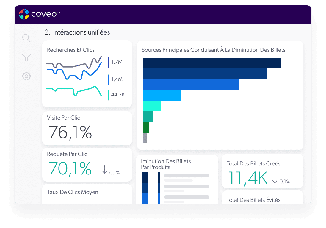 En outre, nous aidons à mesurer des paramètres importants tels que les taux de détournement des dossiers. Le détournement de cas est le taux auquel les clients qui avaient l'intention de demander de l'aide peuvent trouver des solutions à leurs problèmes sans avoir besoin de contacter le support ou d'ouvrir un ticket. En analysant le nombre de cas évités et les économies associées, Coveo peut évaluer le succès des initiatives de libre-service.