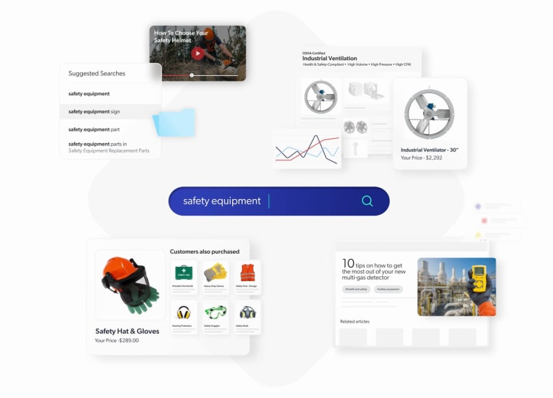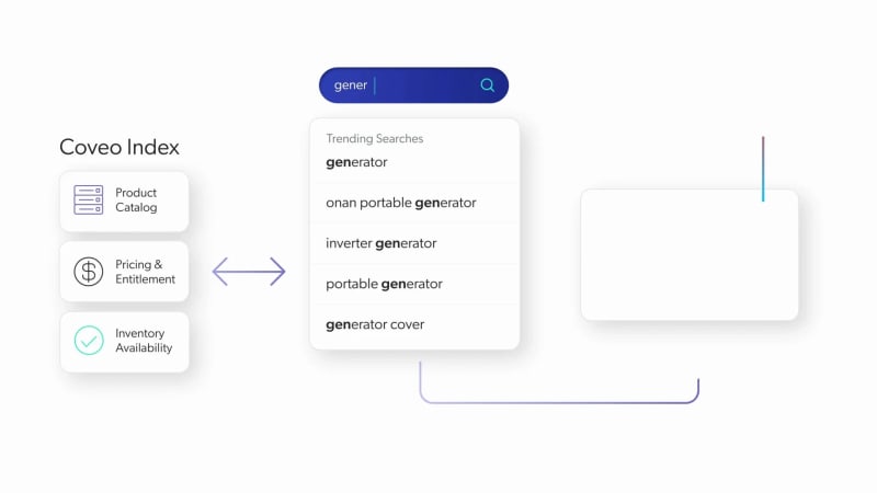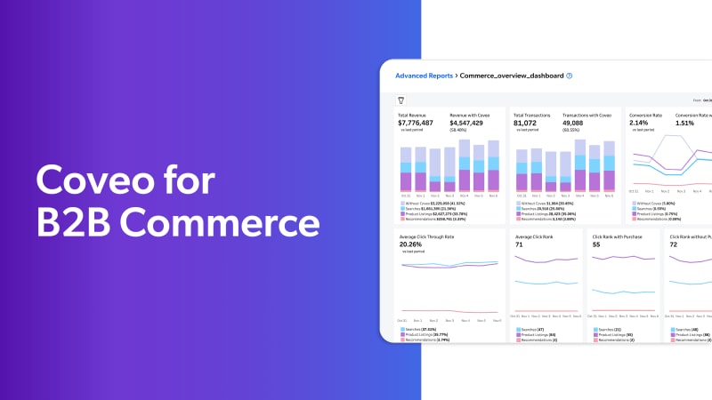 Coveo is an AI cloud platform that powers search, recommendations, and personalization experiences for commerce storefronts. Coveo is well tuned for large and complex b to b requirements. With unique indexing technology, innovative machine learning, and proven enterprise scalability for some of the industry's most extensive digital storefronts. Let's take a quick look at Coveo in action. When customers log in, they're presented with a home page that is personalized for them based on previous interactions, their context, order preferences, and more. For example, here we notice buy again recommendations based on previously purchased sonar equipment as well as recommendations based on recently viewed products. When using the search box, Coveo automatically suggests queries and displays relevant product previews while customers type. It does not matter if a customer is searching by product name or SKU if the SKU is not formatted correctly or even if they make an error in spelling. Coveo's automatic query correction leads them to the most relevant results. This is all driven by machine learning and successful outcomes from previous searches. This does not rely on keyword matching or a lot of manual rules created by your commerce team. The search results page also tunes the order of products for relevance based on machine learning. However, merchandising teams can also easily tune results according to your business needs, such as boosting items for campaigns or promotions. Notice the category GPS has been automatically selected based on our search. This is part of our dynamic navigation experience functionality. This automatic scoping ensures that if a customer sorts on pricing from low to high, they will still see only GPSs rather than less relevant items such as GPS accessories. As most b to b catalogs are large and complex, where products might have hundreds of associated attributes, it can be a challenge for customers to find the exact item they need fast and efficiently. Coveo can help again here with the dynamic navigation functionality. This means the filters that are shown, the order of the filters, and the values within each filter will automatically appear or reorder based on context of the search and popularity. Customer specific pricing and product availability means search can get complicated fast in b two b. However, Coveo is able to handle this seamlessly with our unique indexing capability. Here, we see the pricing for Bob the boat builder. But if we switch to a non logged in session, the public pricing is displayed. The result is a low assisted sales cost and less frustration for customers. Moving down on the product detail page, we see a variety of recommendation models at work here. As Coveo captures more information on your customers' behaviors and purchases, the machine learning model will automatically tune and recommend the most relevant products for them. Your b2b buyers might also be looking for other types of information to make a decision. Coveo can help you streamline their journey by surfacing any type of content within a single unified result set. Here, we can see documents, manuals, orders, and parts that are contextualized to the search performed. New customers may typically land directly on a listing page from a Google search. Coveo AI can ensure they land well by also optimizing listing pages automatically so that products are ranked for relevance and conversion. Coveo also uniquely manages real time availability directly from the listing page, so buyers can filter and view inventory by locations or what's available to ship now. A last note on personalization, as Coveo AI is able to map out product affinities and tracks each in session event, query suggestions and the way products are ranked will adjust in real time. For example, here we see when Bob searches for a radio. The handheld radios are ranked at the top which is different from someone who has just landed on the site and performed the same search. Finally, with Coveo's preconfigured analytics dashboards, you can easily report on top performing queries, understand what products customers are searching for and not finding, or accurately measure attribution between search and product recommendations. This has been a quick overview of how Coveo can power more intelligent buying experiences on your storefront.
